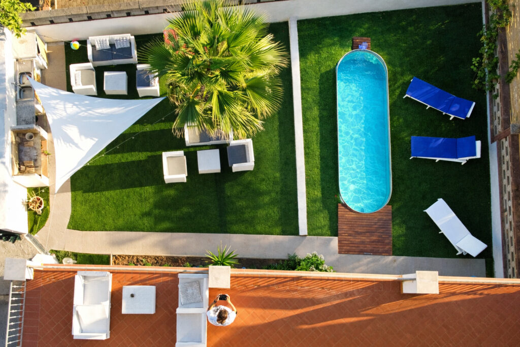 Na severnej strane domu sa nachádza spoločný relaxačný priestor s bazénom, kvalitnou umelou trávou, grilom a posedením pod krásnou palmou. Bazén má hĺbku 65cm preto je určený hlavne pre deti alebo na relax. K dispozícií je gril, umývadlo, práčka, grilovacie potreby, pohodlné posedenie, lehátka a štýlové nočné osvetlenie. Dominantou priestoru je krásna palma a k dispozící aj menšie detské ihrisko.